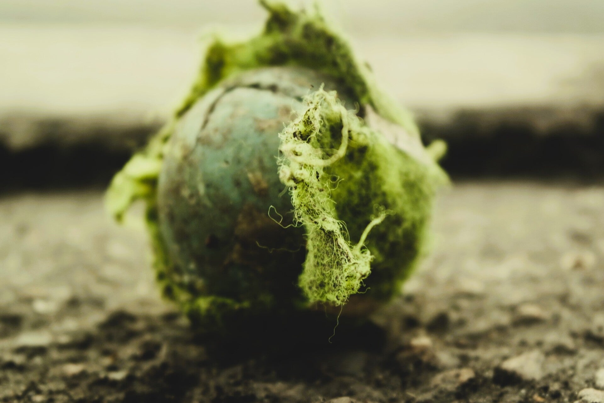 Les restes de mon amour du tennis. Soyons clair, je ne suis pas responsable du triste sort de cette balle ! Soleil éclaté.